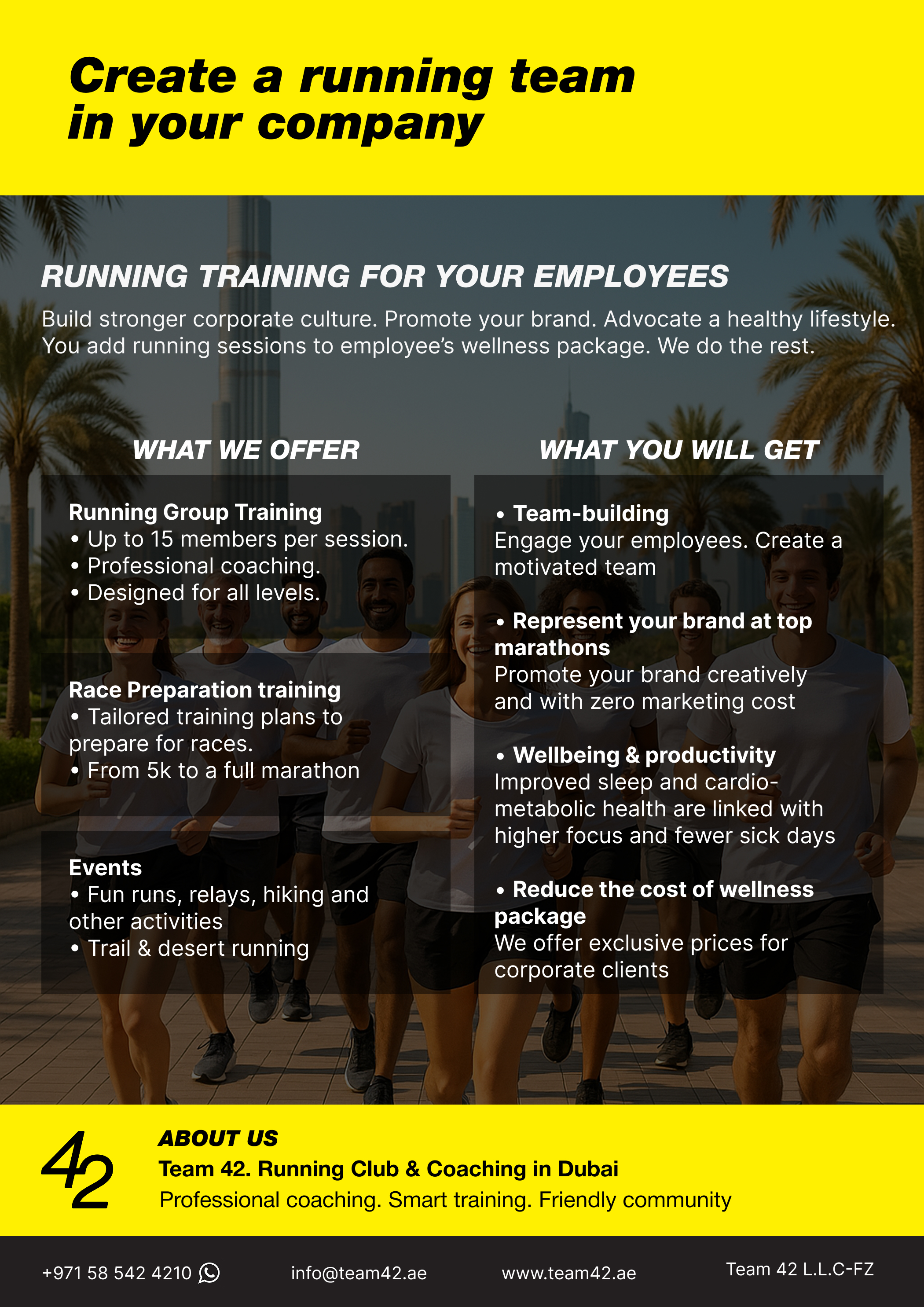 Weekly sessions, progress checks, and race‑day support. Monthly report to HR with attendance and highlights.